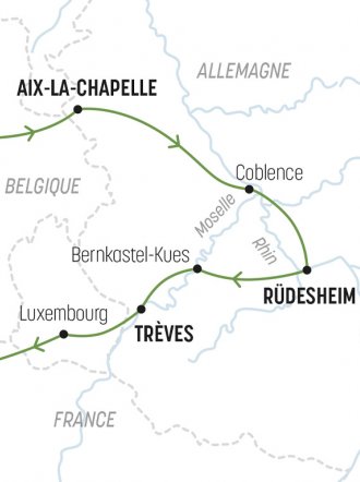 De côteaux en terrasses jalonnées de vieux châteaux, les célèbres vallées du Rhin romantique et de la Moselle offrent des paysages typiques semés de villages pittoresques. Depuis Rüdesheim où vous séjournez, vous embarquez à bord d’un navire de la KD pour une croisière sur la plus belle partie du Rhin jusqu’à Coblence. Au programme aussi de ce court-séjour, vous appréciez le charme des cités historiques de Trèves ou de Bernkastel-Kues et vous visitez Luxembourg-ville.